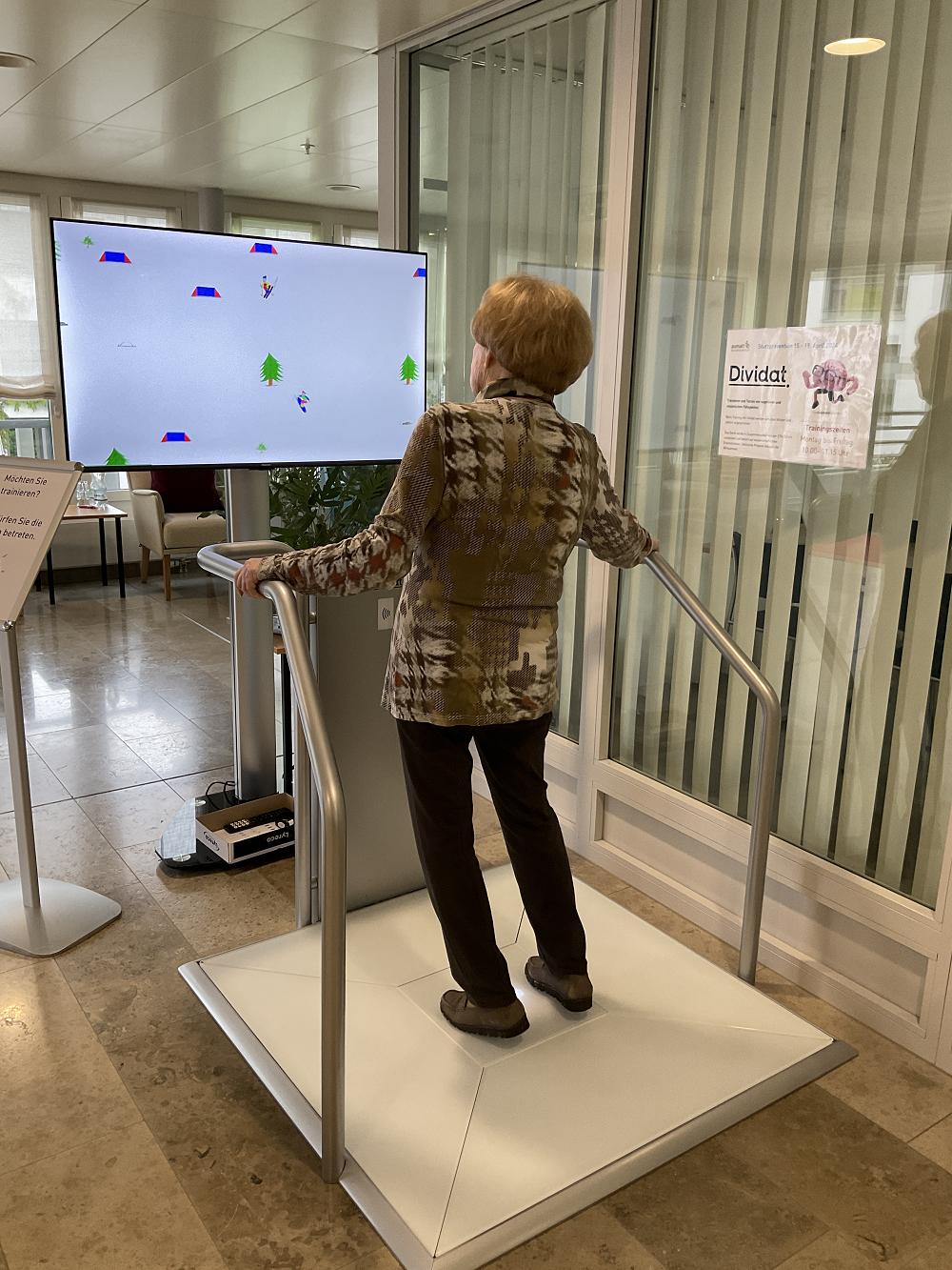 Um fit zu bleiben, reicht es aber nicht aus, nur den Körper zu trainieren, sondern es bedarf auch einer Verbindung zwischen Kognition und Motorik. Die Firma Dividat bot uns die Möglichkeit, ein Dividat Senso Trainingsgerät für diese Woche auszuleihen. Das Gerät wurde in Zusammenarbeit mit der ETH Zürich entwickelt und basiert auf wissenschaftlichen Erkenntnissen. Es umfasst verschiedene Trainingsprogramme, die gezielt Denkaufgaben mit Bewegung interaktiv verbinden. Sogar die Mitarbeitenden hatten ihre Herausforderungen mit einzelnen Trainings.